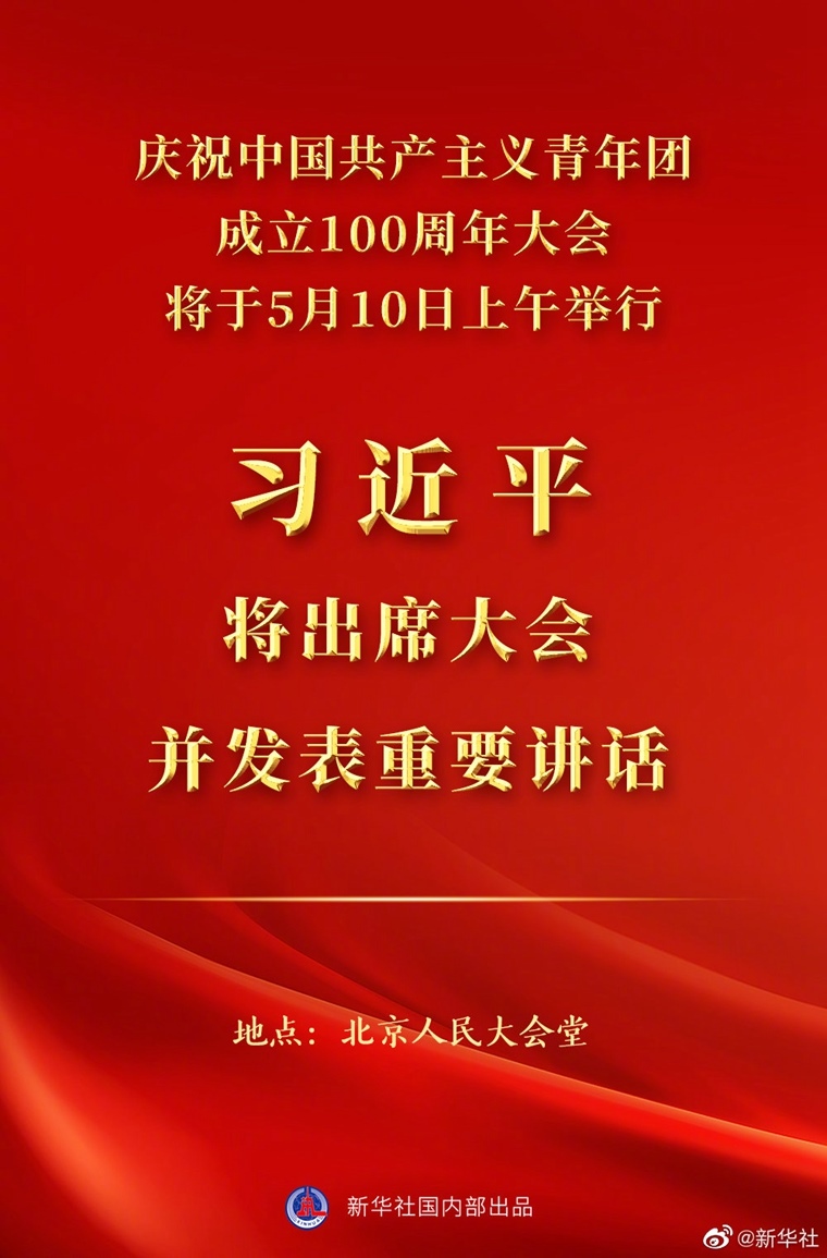 新華社北京5月8日電慶祝中國(guó)共產(chǎn)主義青年團(tuán)成立100周年大會(huì)將于5月10日上午在北京人民大會(huì)堂隆重舉行。中共中央總書(shū)記、國(guó)家主席、中央軍委主席習(xí)近平將出席大會(huì)并發(fā)表重要講話。