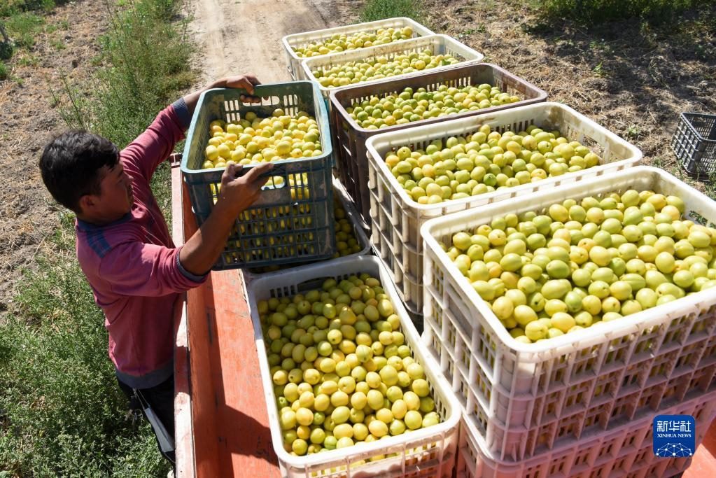 在新疆阿克蘇地區(qū)庫車市齊滿鎮(zhèn)齊滿村,農戶將采摘的小白杏裝車(2021年7月1日攝)。新華社記者 丁磊 攝