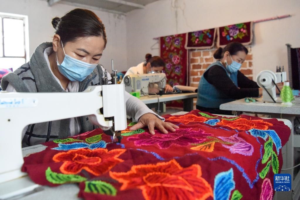 在新疆吉木薩爾縣白泉村刺繡專業(yè)合作社,繡娘在制作哈薩克族刺繡(2021年1月23日攝)。新華社記者 丁磊 攝