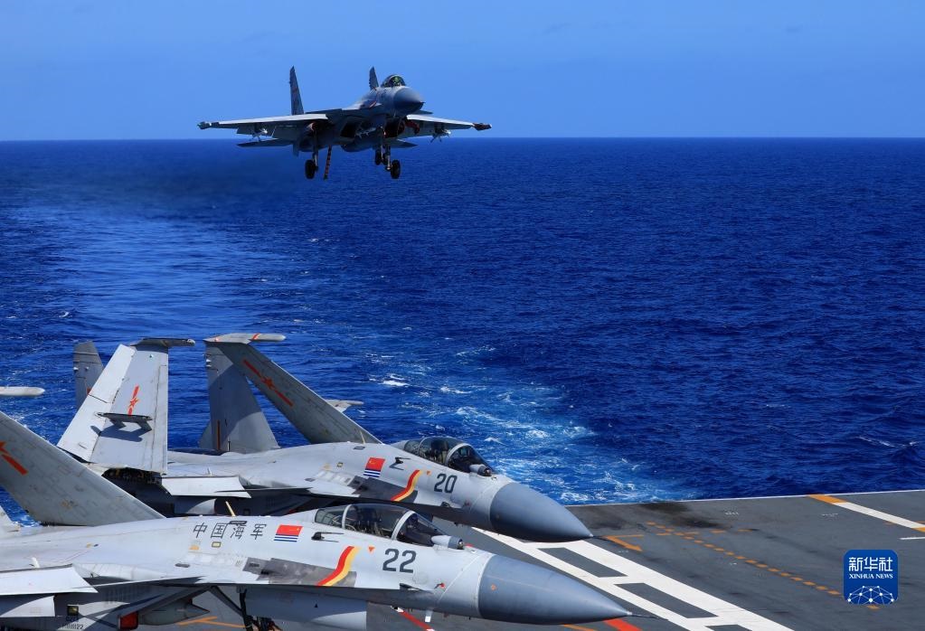 海軍遼寧艦編隊(duì)遠(yuǎn)海實(shí)戰(zhàn)化訓(xùn)練期間,殲-15艦載戰(zhàn)斗機(jī)準(zhǔn)備著艦(資料照片)。新華社發(fā)(胡善敏攝)