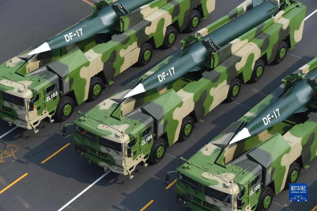 2019年10月1日上午,慶祝中華人民共和國(guó)成立70周年大會(huì)在北京天安門廣場(chǎng)隆重舉行。這是東風(fēng)-17常規(guī)導(dǎo)彈方隊(duì)。新華社記者潘昱龍攝