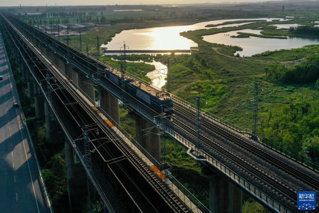 重載列車行駛在大秦鐵路上(2022年7月16日攝,無人機(jī)照片)。為做好迎峰度夏能源保供工作,中國鐵路太原局集團(tuán)有限公司在確保運(yùn)輸安全的前提下全力提升煤炭運(yùn)量。新華社記者曹陽攝
