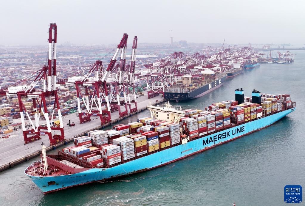 在山東港口青島港前灣碼頭,歐洲貿(mào)易航線的“美途馬士基”集裝箱貨輪解纜起航(2022年7月29日攝,無人機(jī)照片)。新華社記者李紫恒攝