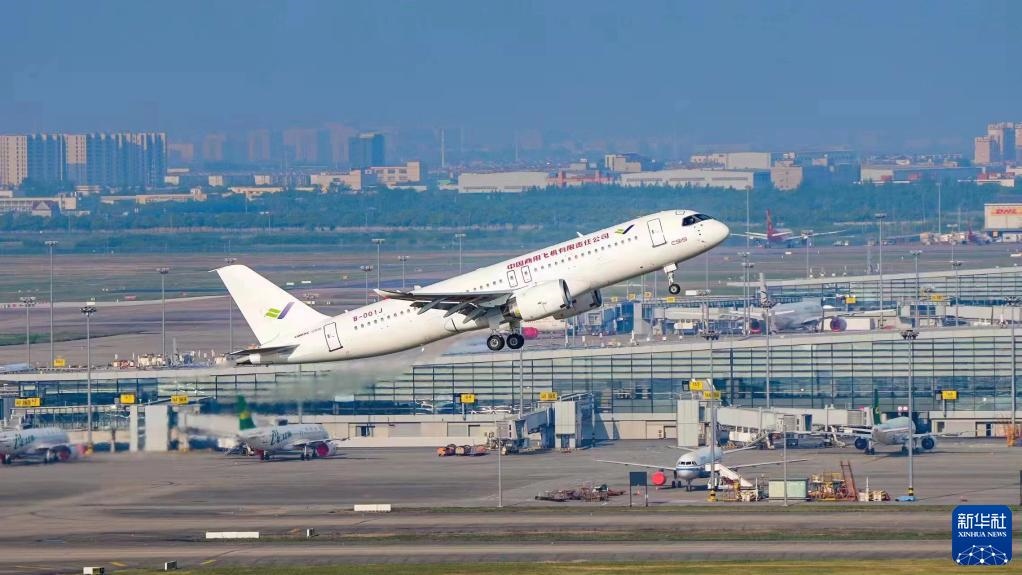 2022年5月14日6時(shí)52分,編號(hào)為B-001J的C919大飛機(jī)從上海浦東機(jī)場(chǎng)第4跑道起飛,于9時(shí)54分安全降落,標(biāo)志著中國商飛公司即將交付首家用戶的首架C919大飛機(jī)首次飛行試驗(yàn)圓滿完成。新華社發(fā)