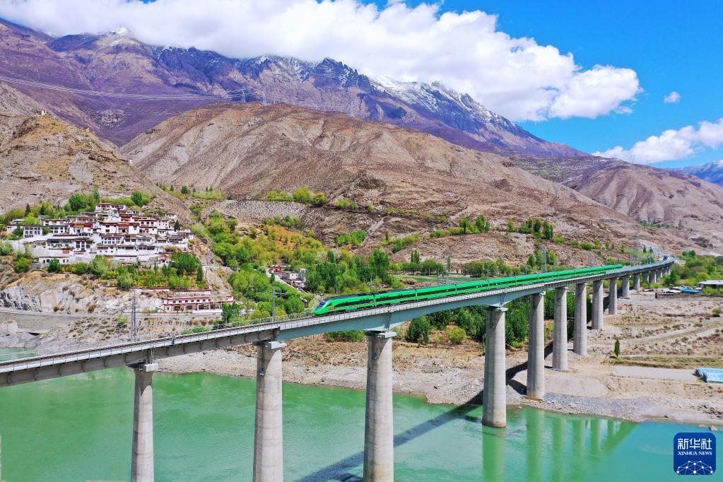 復(fù)興號(hào)列車行駛在西藏朗縣境內(nèi)(2022年4月14日攝)。新華社記者 覺果 攝