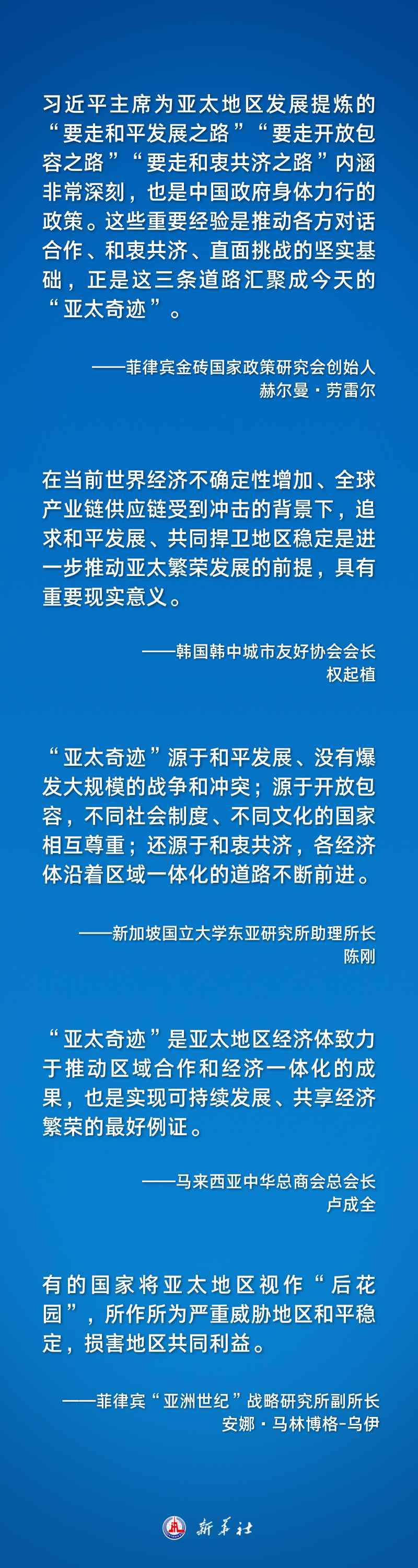 對于亞太未來發(fā)展繁榮,習(xí)近平主席提出重要主張:要攜手構(gòu)建亞太命運(yùn)共同體,再創(chuàng)亞太合作新輝煌。多國人士認(rèn)為,“維護(hù)國際公平正義,建設(shè)和平穩(wěn)定的亞太”“堅(jiān)持開放包容,建設(shè)共同富裕的亞太”“堅(jiān)持綠色低碳發(fā)展,建設(shè)清潔美麗的亞太”“堅(jiān)持命運(yùn)與共,建設(shè)守望相助的亞太”為亞太地區(qū)未來發(fā)展指明了方向和路徑。