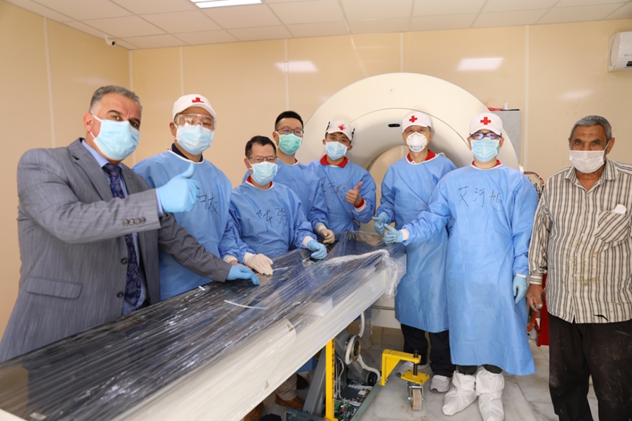 2020年4月12日,在伊拉克首都巴格達(dá),援助伊拉克防治新冠肺炎的中國(guó)醫(yī)療專(zhuān)家將CT設(shè)備搬運(yùn)到機(jī)房后與伊方人員合影。