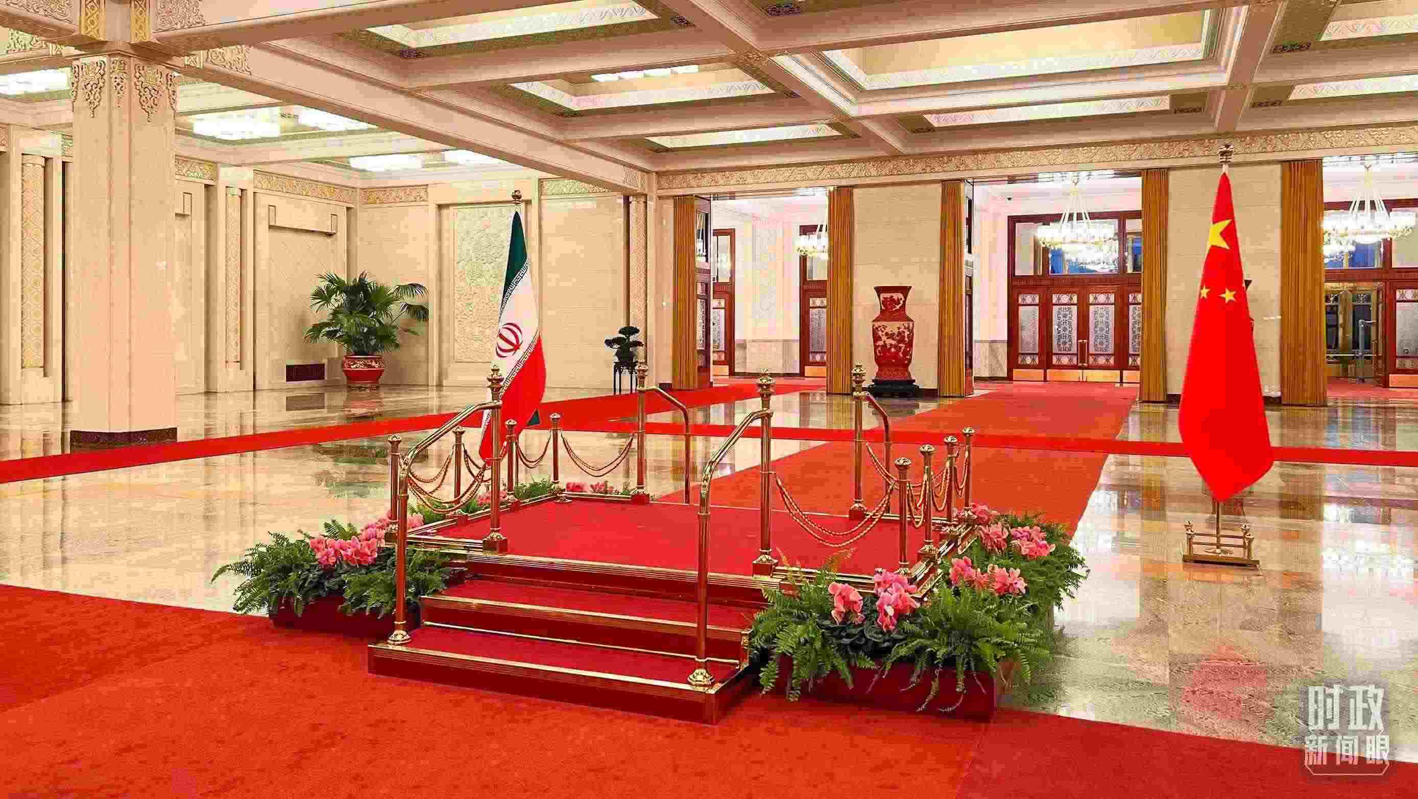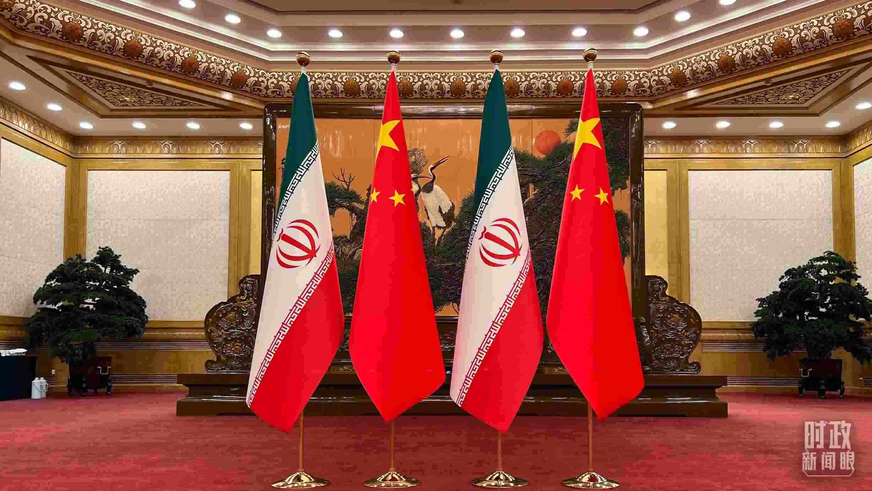 △2月14日會談現(xiàn)場的中伊兩國國旗。(總臺央視記者郁振一拍攝)