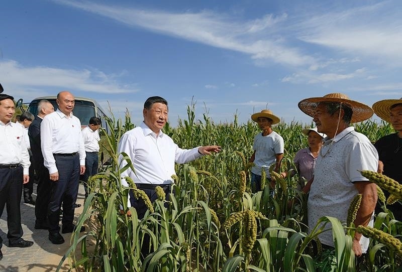 △2021年9月13日,習(xí)近平總書記在陜西米脂縣高西溝村臨時(shí)下車,察看糧食作物長勢(shì),同正在田間勞作的老鄉(xiāng)拉家常。