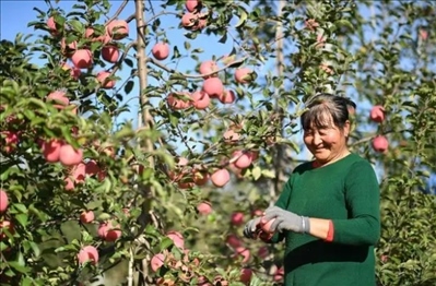 △2022年10月,果農在延安市洛川縣阿寺村一處果園采摘。