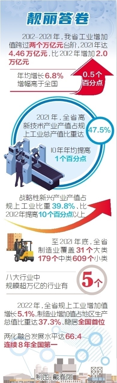 制造業(yè)規(guī)模實力保持領先。我省把制造業(yè)高質量發(fā)展擺在更加突出位置,加快傳統(tǒng)產業(yè)轉型和戰(zhàn)略性新興產業(yè)發(fā)展,推進產業(yè)邁向中高端水平。工業(yè)增加值10年跨過3萬億、4萬億兩個臺階,2021年達4.46萬億元,比2012年增加2.0萬億元,年均增長6.8%,增幅高于全國0.5個百分點。