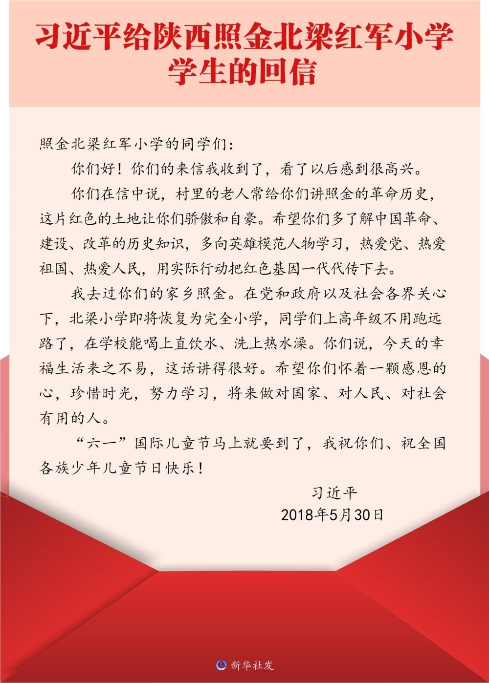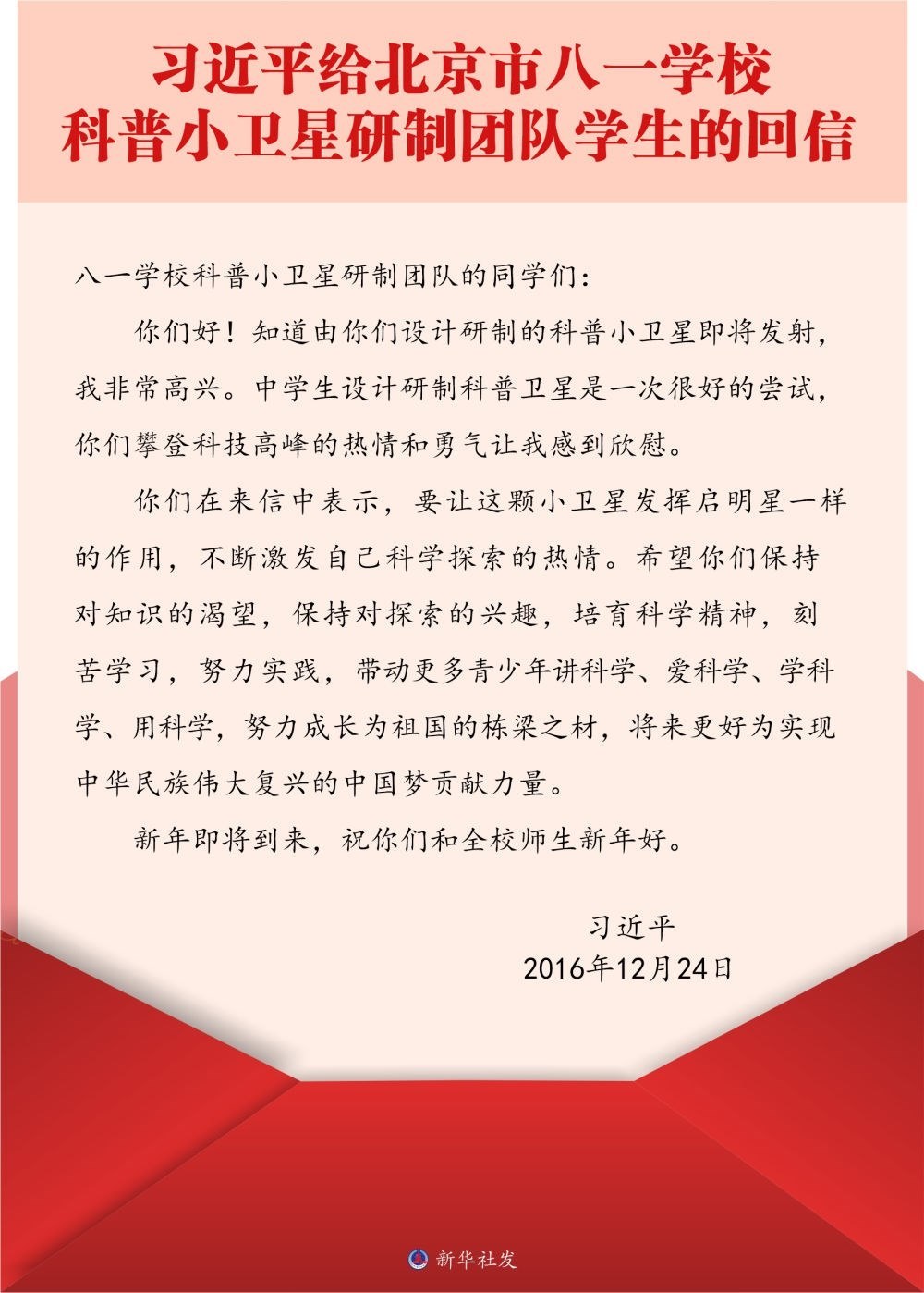 北京市八一學校是習近平總書記的母校。2016年底,八一學校的學生們給習近平總書記寫信,報告了他們參與設計研制的科普小衛(wèi)星即將發(fā)射的消息。很快,孩子們收到了總書記的回信。