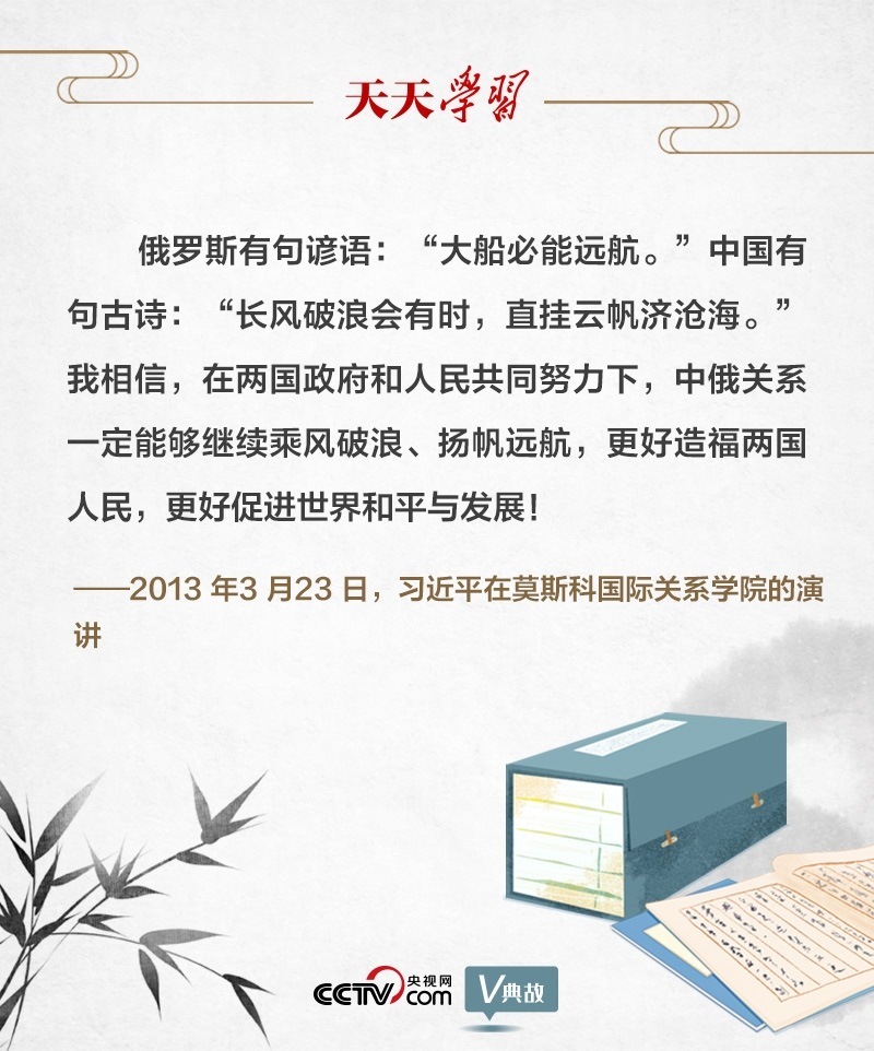 關(guān)于中俄關(guān)系,早在10年前在莫斯科國(guó)際關(guān)系學(xué)院的演講中,習(xí)近平主席就有精辟闡述。演講結(jié)束語(yǔ)中,習(xí)主席首先引用一句俄羅斯諺語(yǔ)“大船必能遠(yuǎn)航”,拉近了與俄羅斯民眾的文化空間和心理距離。接著引用了含義相近的中國(guó)古詩(shī)“長(zhǎng)風(fēng)破浪會(huì)有時(shí),直掛云帆濟(jì)滄?!保寣?duì)方在文化相似性中深刻領(lǐng)悟其中道理。最后凝聚共同理念:“中俄關(guān)系一定能夠繼續(xù)乘風(fēng)破浪、揚(yáng)帆遠(yuǎn)航”。