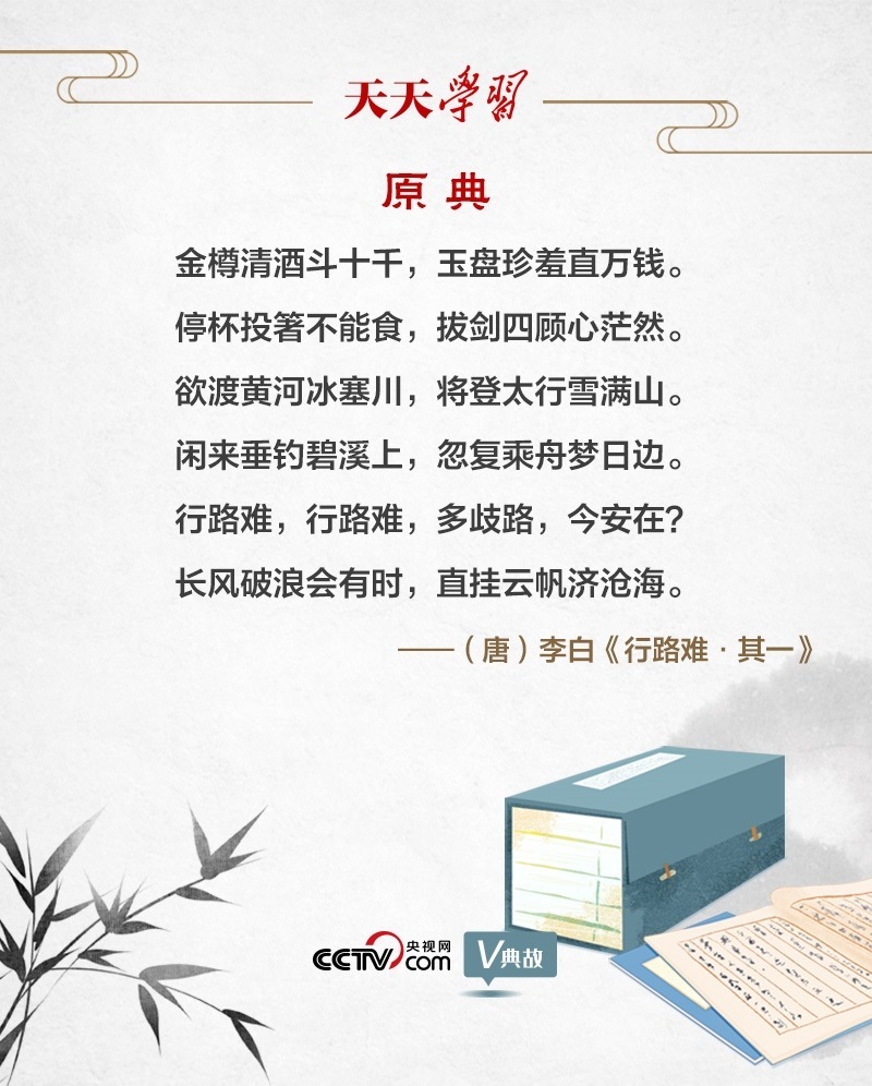 “行路難”為樂(lè)府古題,多詠嘆世路艱難及貧困孤苦的處境。李白的《行路難》共三首,“長(zhǎng)風(fēng)破浪會(huì)有時(shí)”出自第一首。唐天寶元年(742年),李白奉詔入京,擔(dān)任翰林供奉。后因權(quán)臣讒毀排擠,被“賜金放還”。《行路難》便是李白離開(kāi)長(zhǎng)安時(shí)所作。