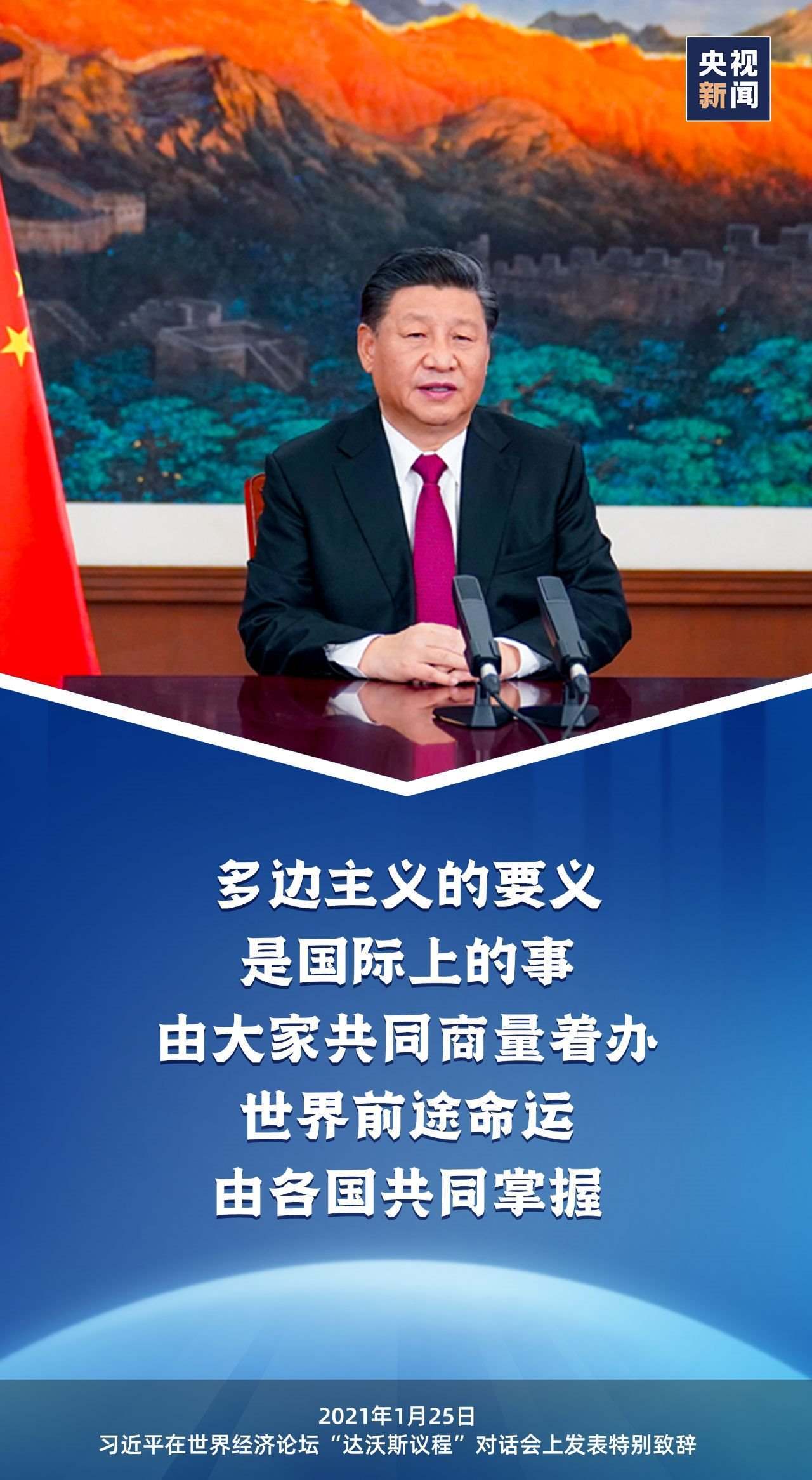 在2021年1月召開的世界經(jīng)濟(jì)論壇“達(dá)沃斯議程”對(duì)話會(huì)上,習(xí)近平主席發(fā)表特別致辭,再次強(qiáng)調(diào)踐行多邊主義,并指出“多邊主義的要義是國(guó)際上的事由大家共同商量著辦”。