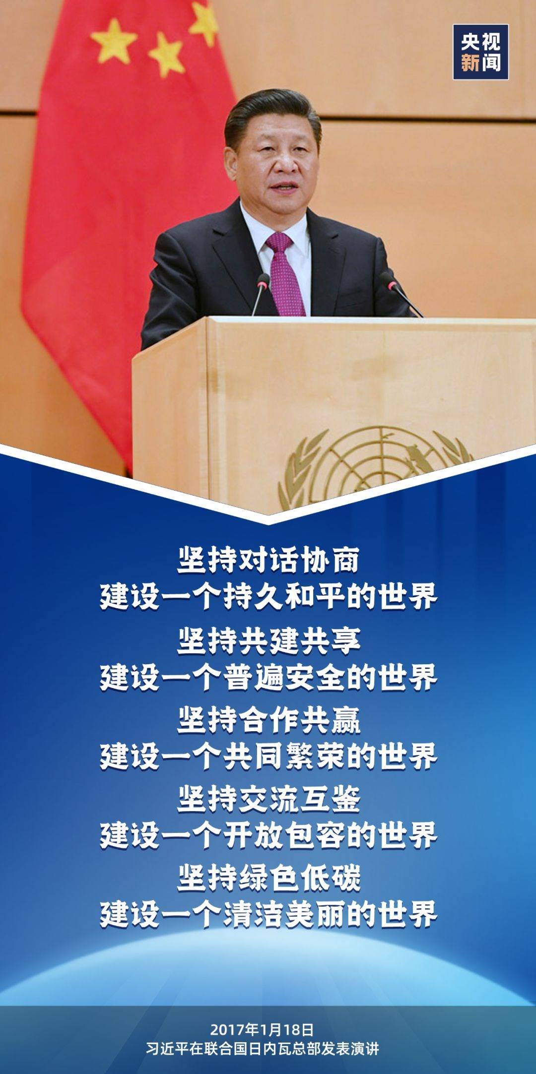 這樣的情景出現(xiàn)在2017年1月,習(xí)近平主席在聯(lián)合國(guó)日內(nèi)瓦總部發(fā)表題為《共同構(gòu)建人類命運(yùn)共同體》的主旨演講的現(xiàn)場(chǎng)。