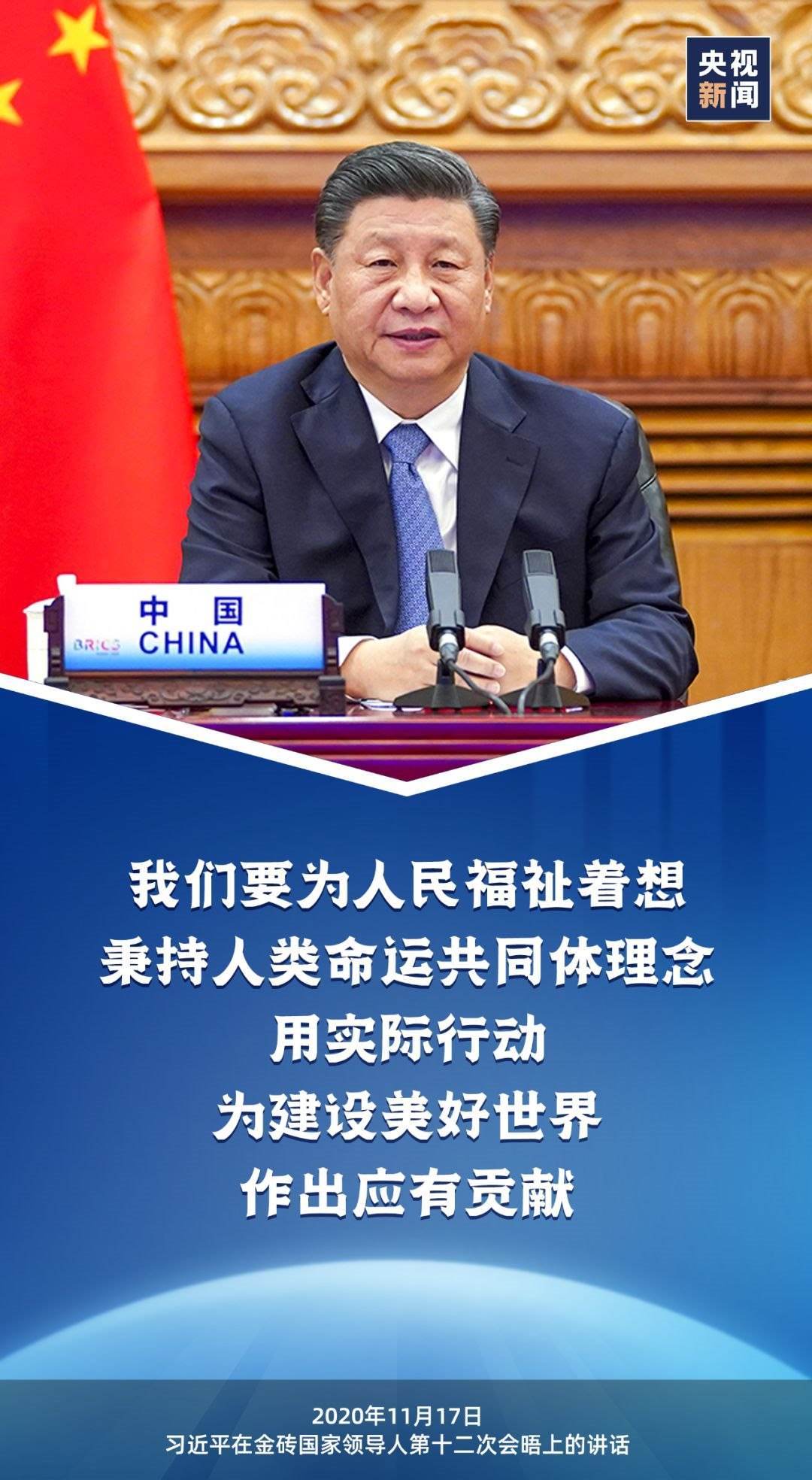 2020年11月17日,國(guó)家主席習(xí)近平出席金磚國(guó)家領(lǐng)導(dǎo)人第十二次會(huì)晤并發(fā)表重要講話時(shí)指出,“我們要為人民福祉著想,秉持人類命運(yùn)共同體理念,用實(shí)際行動(dòng)為建設(shè)美好世界作出應(yīng)有貢獻(xiàn)?!?/p>