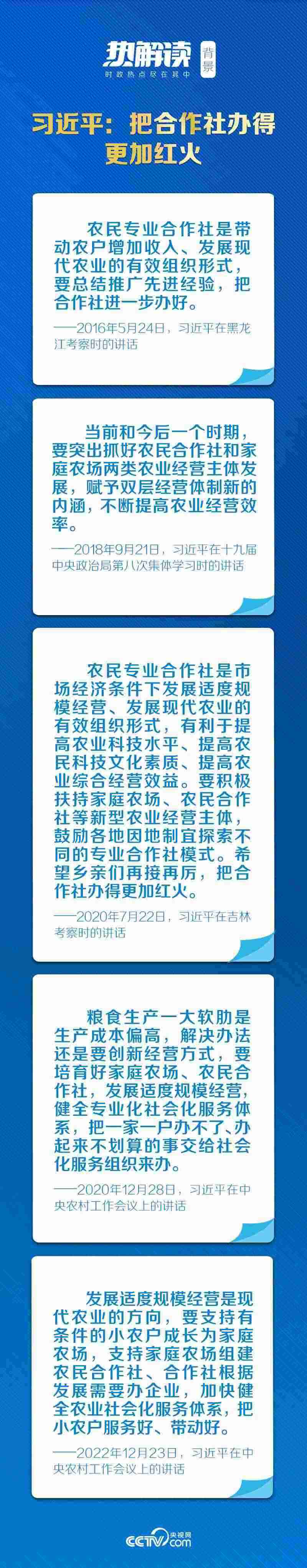 合作社是市場(chǎng)經(jīng)濟(jì)條件下發(fā)展適度規(guī)模經(jīng)營(yíng)和現(xiàn)代農(nóng)業(yè)的有效組織形式。黨的十八大以來(lái),總書(shū)記不止一次走進(jìn)合作社,關(guān)切農(nóng)業(yè)、農(nóng)村發(fā)展,思考中國(guó)特色的農(nóng)業(yè)現(xiàn)代化之路。