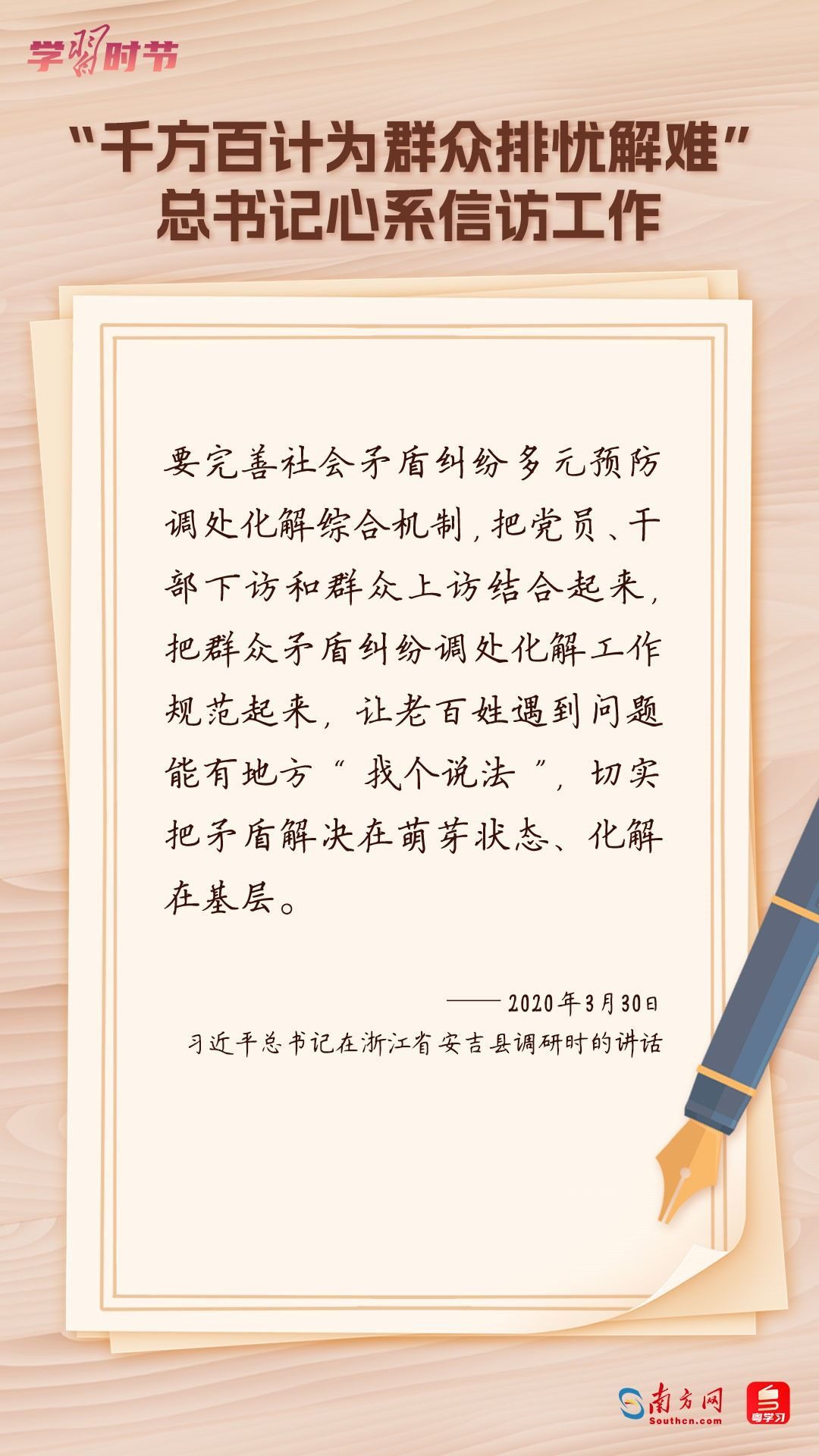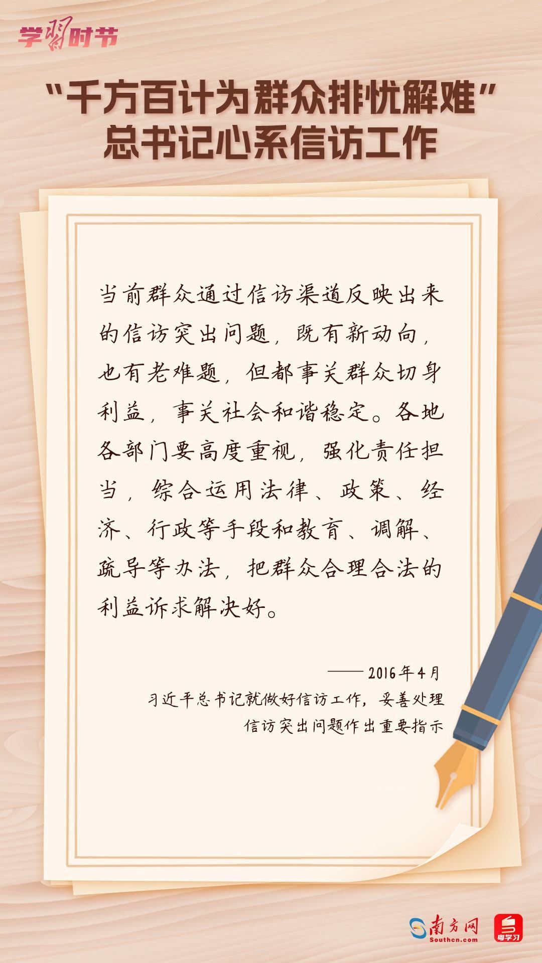 2022年5月1日,中共中央、國務(wù)院印發(fā)的《信訪工作條例》正式實(shí)施?!缎旁L工作條例》以習(xí)近平新時(shí)代中國特色社會(huì)主義思想為指導(dǎo),深入貫徹習(xí)近平總書記關(guān)于加強(qiáng)和改進(jìn)人民信訪工作的重要思想,總結(jié)黨長期以來領(lǐng)導(dǎo)和開展信訪工作經(jīng)驗(yàn)特別是黨的十八大以來信訪工作制度改革成果,堅(jiān)持和加強(qiáng)黨對(duì)信訪工作的全面領(lǐng)導(dǎo),理順信訪工作體制機(jī)制,是新時(shí)代信訪工作的基本遵循。今年5月1日是《信訪工作條例》實(shí)施一周年,“學(xué)習(xí)時(shí)節(jié)”整理摘錄習(xí)近平總書記關(guān)于信訪工作的重要講話和重要指示批示,與您一同學(xué)習(xí)。