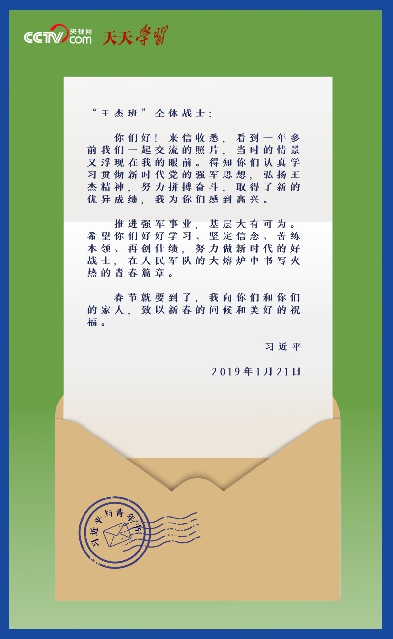 “你們好!來(lái)信收悉,看到一年多前我們一起交流的照片,當(dāng)時(shí)的情景又浮現(xiàn)在我的眼前。得知你們認(rèn)真學(xué)習(xí)貫徹新時(shí)代黨的強(qiáng)軍思想,弘揚(yáng)王杰精神,努力拼搏奮斗,取得了新的優(yōu)異成績(jī),我為你們感到高興……”