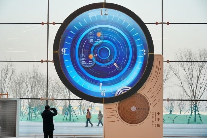 雄安站候車廳,一座“千年輪”吸引著往來旅客的目光。它的起始日期被設(shè)定為2017年4月1日——“雄安”第一次被公眾知曉的日子?!扒贻啞钡牡鬃希澘讨?個金色大字——“千年之計 始于當(dāng)下”。齒輪不停地轉(zhuǎn)動,記錄下歷史前進的軌跡。
