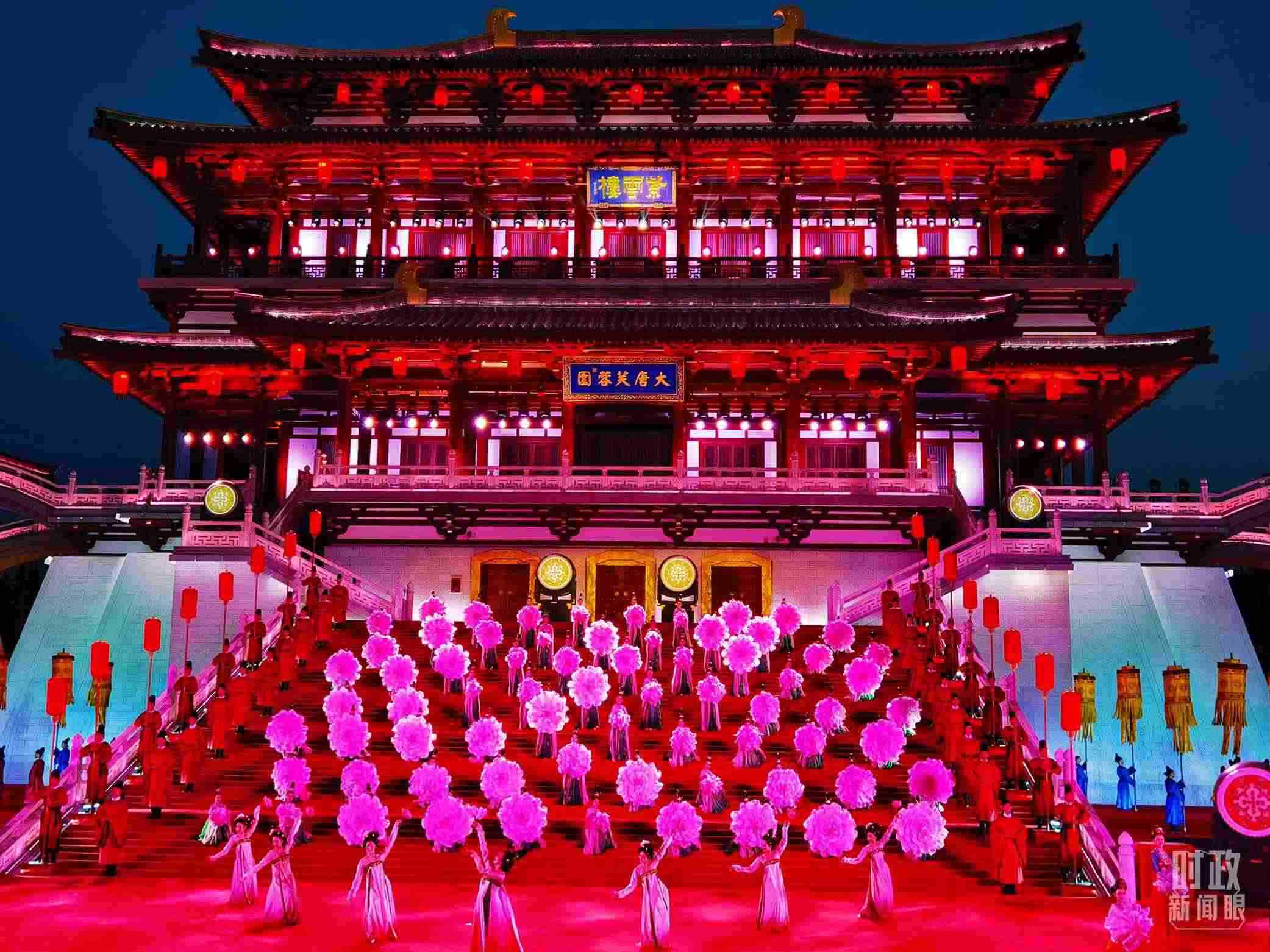 △紫云樓是大唐芙蓉園最主要的仿唐建筑群之一。18日晚的迎賓表演就是以紫云樓為背景。(總臺央視記者劉琦拍攝)