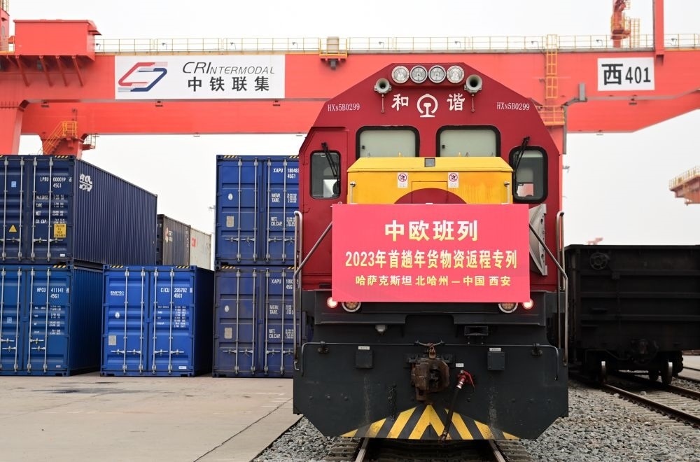 滿載著來(lái)自哈薩克斯坦1300噸面粉的中歐班列抵達(dá)西安國(guó)際港站(1月13日攝)。新華社記者 李一博 攝