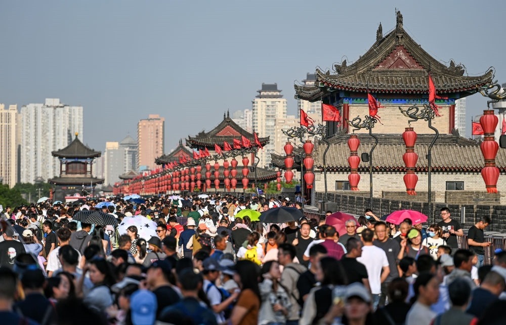 游客在西安城墻景區(qū)參觀游覽(4月30日攝)。新華社發(fā)(鄒競一 攝)
