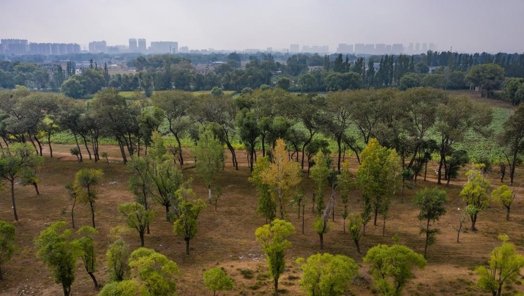 2020年9月27日拍攝的陜西省靖邊縣城旁的西草灘濕地公園(無人機照片)。新華社記者 陶明 攝