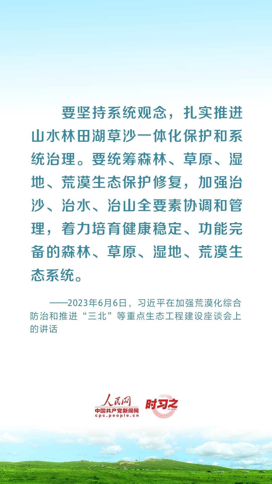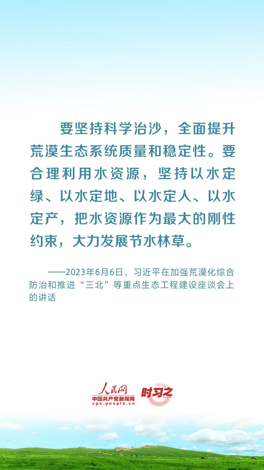 2023年6月5日至6日,中共中央總書記、國(guó)家主席、中央軍委主席習(xí)近平在內(nèi)蒙古自治區(qū)巴彥淖爾市考察,主持召開加強(qiáng)荒漠化綜合防治和推進(jìn)“三北”等重點(diǎn)生態(tài)工程建設(shè)座談會(huì)并發(fā)表重要講話。座談會(huì)上,習(xí)近平對(duì)走好中國(guó)特色防沙治沙道路提出工作要求。