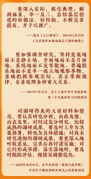 在全黨大興調(diào)查研究之風(fēng)的今天,讓我們重溫總書記的有關(guān)論述,跟著總書記學(xué)習(xí)調(diào)查研究。