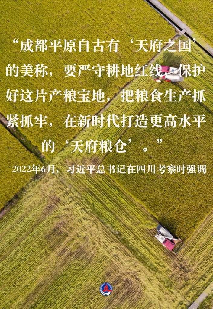 2022年6月,習近平總書記在四川考察時強調(diào),“成都平原自古有‘天府之國’的美稱,要嚴守耕地紅線,保護好這片產(chǎn)糧寶地,把糧食生產(chǎn)抓緊抓牢,在新時代打造更高水平的‘天府糧倉’”。