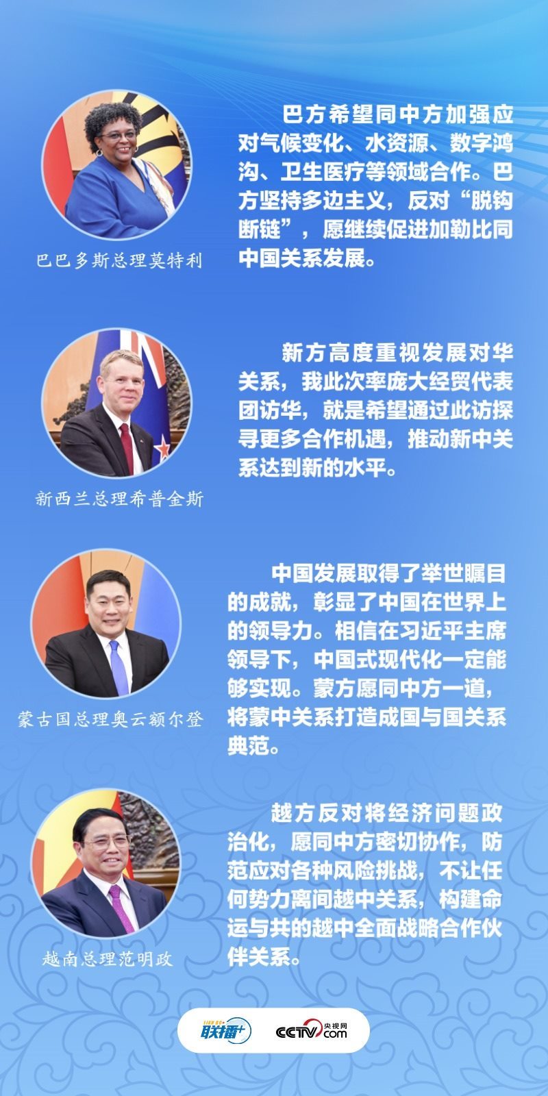 巴巴多斯總理莫特利直言“通過此訪深切感受到巴中之間的團結(jié)與友好”;蒙古國總理奧云額爾登希望“將蒙中關(guān)系打造成國與國關(guān)系典范”;越南總理范明政堅定表示“不讓任何勢力離間越中關(guān)系”;中新關(guān)系長期“領(lǐng)跑”中國同發(fā)達國家關(guān)系,新西蘭總理希普金斯希望此訪能進一步推動雙方合作……6月27日的四場雙邊會見中,幾位外方領(lǐng)導人不約而同對擴大加深雙邊合作充滿信心。