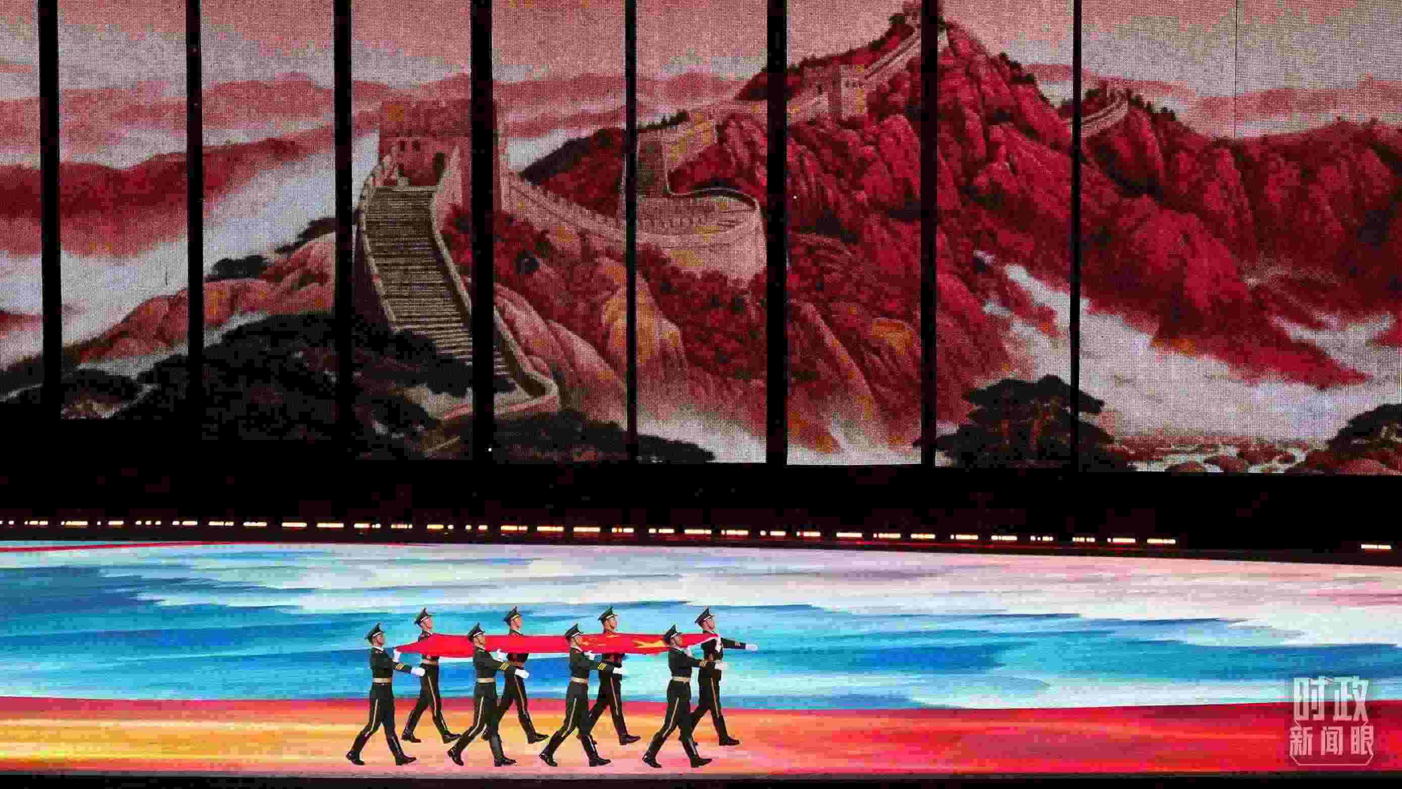 △踏著紅綢鋪就的道路,五星紅旗入場(chǎng)。(總臺(tái)央視記者魏幫軍、國(guó)廣記者李晉拍攝)