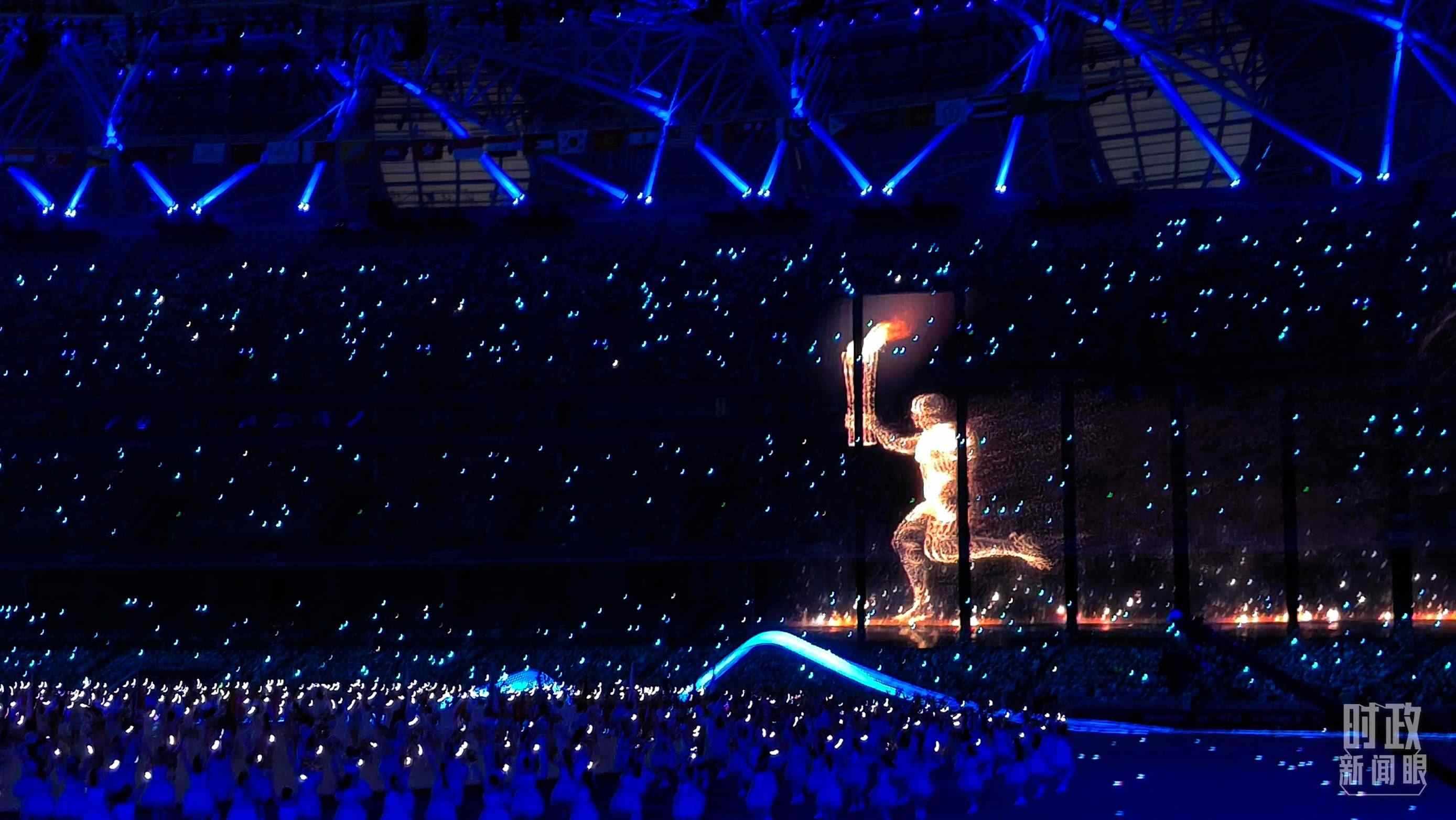 △“數(shù)字火炬手”入場(chǎng),與現(xiàn)場(chǎng)火炬手共同點(diǎn)燃主火炬。(總臺(tái)央視記者王子杭、總臺(tái)國(guó)廣記者李晉拍攝)