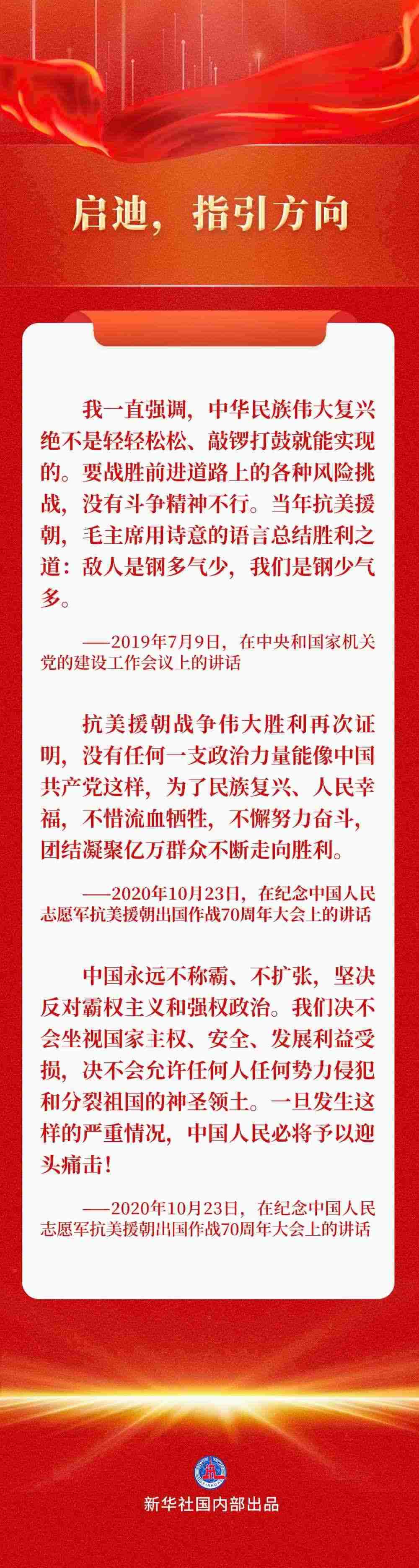 習近平總書記曾多次談起這段氣壯山河的英雄史詩,深情講述這些“最可愛的人”的動人故事,以史為鑒,為全黨全軍全國各族人民指明前行方向。
