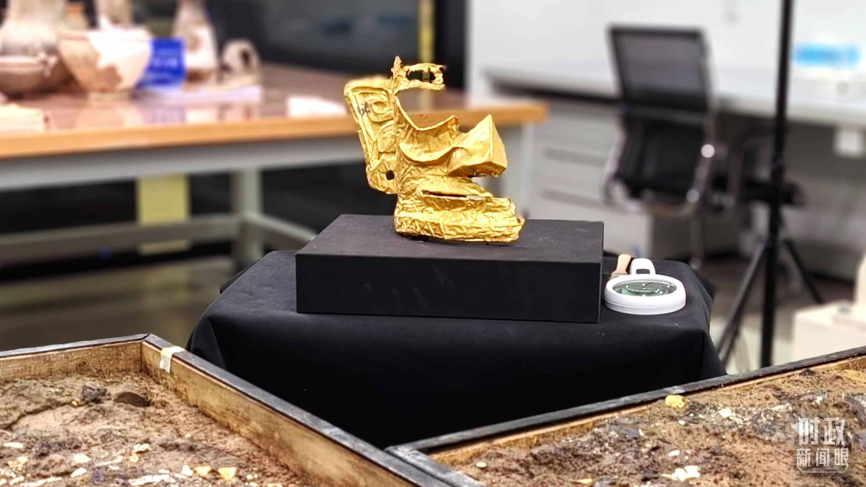 △文物保護修復展示中心內正在修復的金面具。(總臺央視記者王萌萌拍攝)