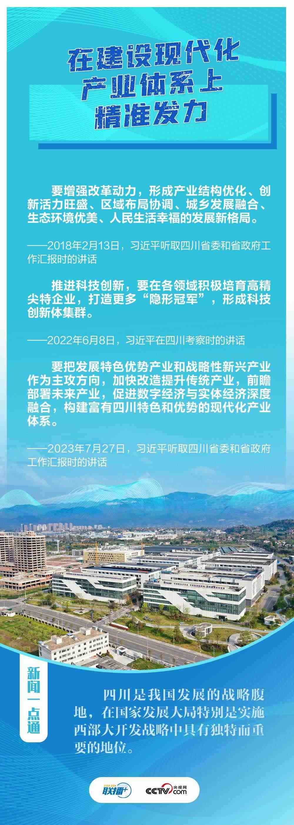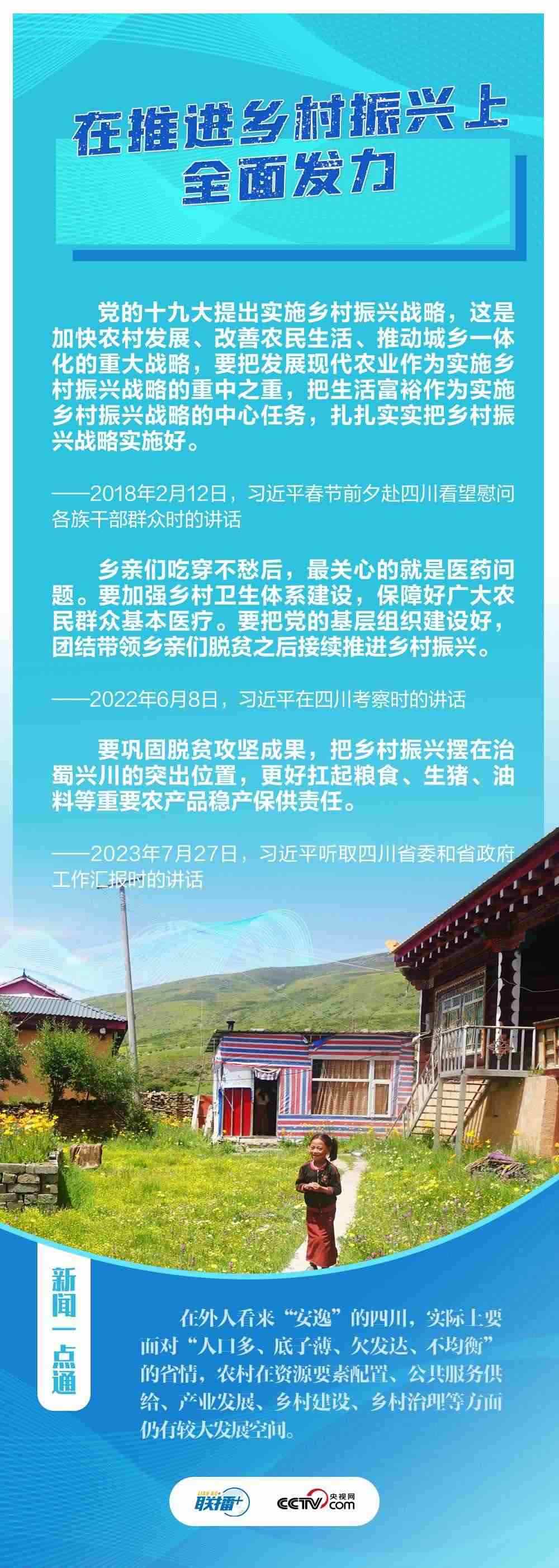 “希望四川在推進科技創(chuàng)新和科技成果轉(zhuǎn)化上同時發(fā)力,在建設現(xiàn)代化產(chǎn)業(yè)體系上精準發(fā)力,在推進鄉(xiāng)村振興上全面發(fā)力,在筑牢長江黃河上游生態(tài)屏障上持續(xù)發(fā)力?!?月27日,在巴蜀大地考察的習近平總書記聽取四川省委和省政府工作匯報,對四川各項工作提出新寄望。