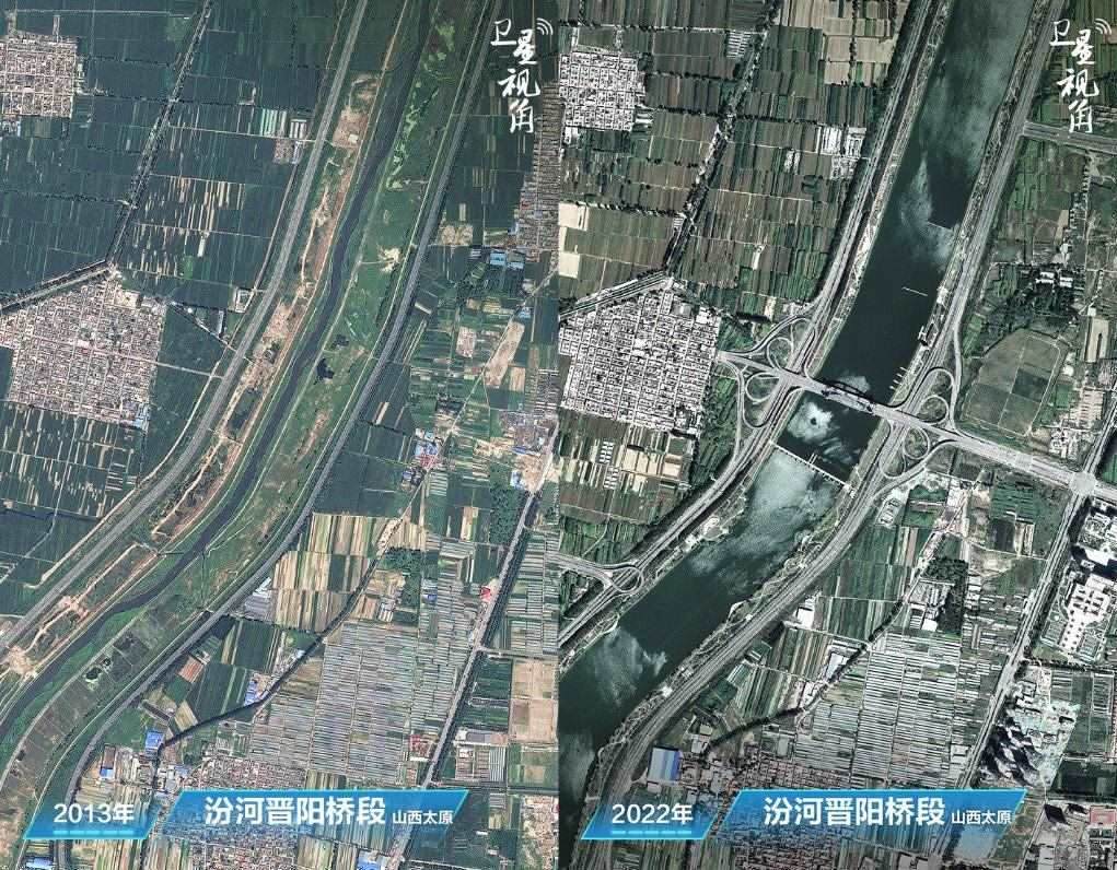 ↑2022年與2013年相比,通過綜合治理和生態(tài)景觀建設,汾河太原城區(qū)晉陽橋段水量更豐、風光更美。
