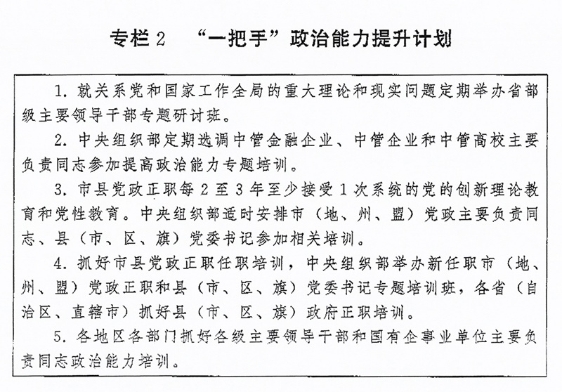 (二)突出“關(guān)鍵少數(shù)”政治訓(xùn)練。堅(jiān)持把政治訓(xùn)練貫穿干部成長(zhǎng)全周期,使干部的政治素養(yǎng)、政治能力與擔(dān)負(fù)的領(lǐng)導(dǎo)職責(zé)相匹配。強(qiáng)化“一把手”政治培訓(xùn),有計(jì)劃地選調(diào)地方、部門、國(guó)有企事業(yè)單位主要負(fù)責(zé)同志到黨校(行政學(xué)院)、干部學(xué)院參加專題培訓(xùn)。實(shí)施“一把手”政治能力提升計(jì)劃(專欄2)。?。ㄗ灾螀^(qū)、直轄市)、市(地、州、盟)、縣(市、區(qū)、旗)黨政領(lǐng)導(dǎo)班子成員每2至3年到黨校(行政學(xué)院)、干部學(xué)院至少接受1次系統(tǒng)的黨的創(chuàng)新理論教育和黨性教育,5年內(nèi)累計(jì)不少于2個(gè)月。圍繞提高政治能力和領(lǐng)導(dǎo)能力,加強(qiáng)機(jī)關(guān)司局長(zhǎng)、處長(zhǎng)任職培訓(xùn)。重視對(duì)女干部、少數(shù)民族干部、黨外干部等的政治培訓(xùn)。加強(qiáng)對(duì)高層次人才的政治引領(lǐng),中央組織部會(huì)同有關(guān)單位每年組織一定數(shù)量人才開展國(guó)情研修。