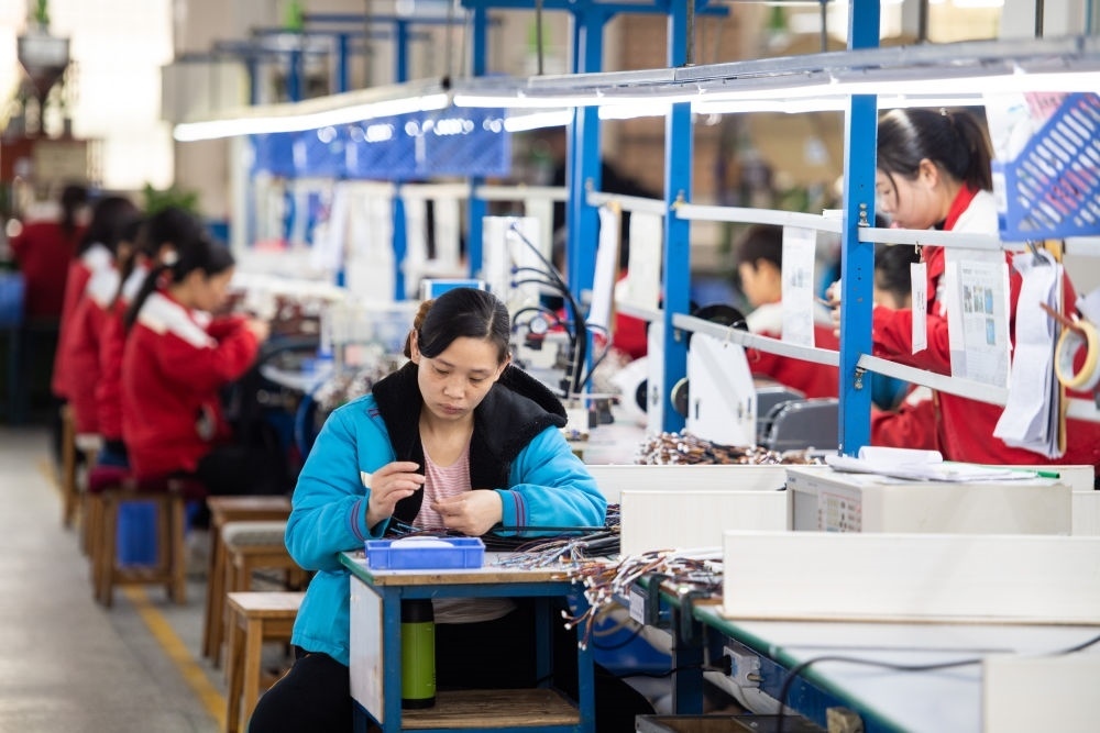 在湖南省汨羅市神鼎山鎮(zhèn)豐倉(cāng)村的“巾幗車(chē)間”,工人在生產(chǎn)數(shù)據(jù)線(xiàn)(2023年3月7日攝)。新華社記者 陳思汗 攝