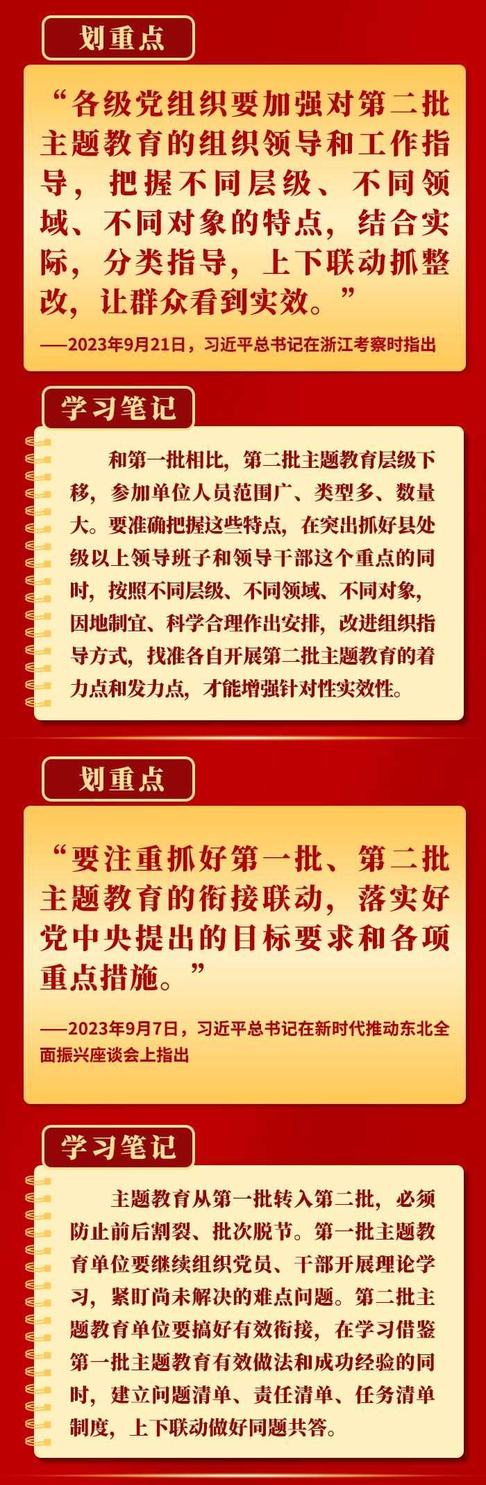 當前,第二批學習貫徹習近平新時代中國特色社會主義思想主題教育扎實推進。9月以來,習近平總書記在黑龍江、浙江、江西考察時,對第二批主題教育工作提出明確要求,為持續(xù)開展好這件“事關全局的大事”指明方向。一起學習。