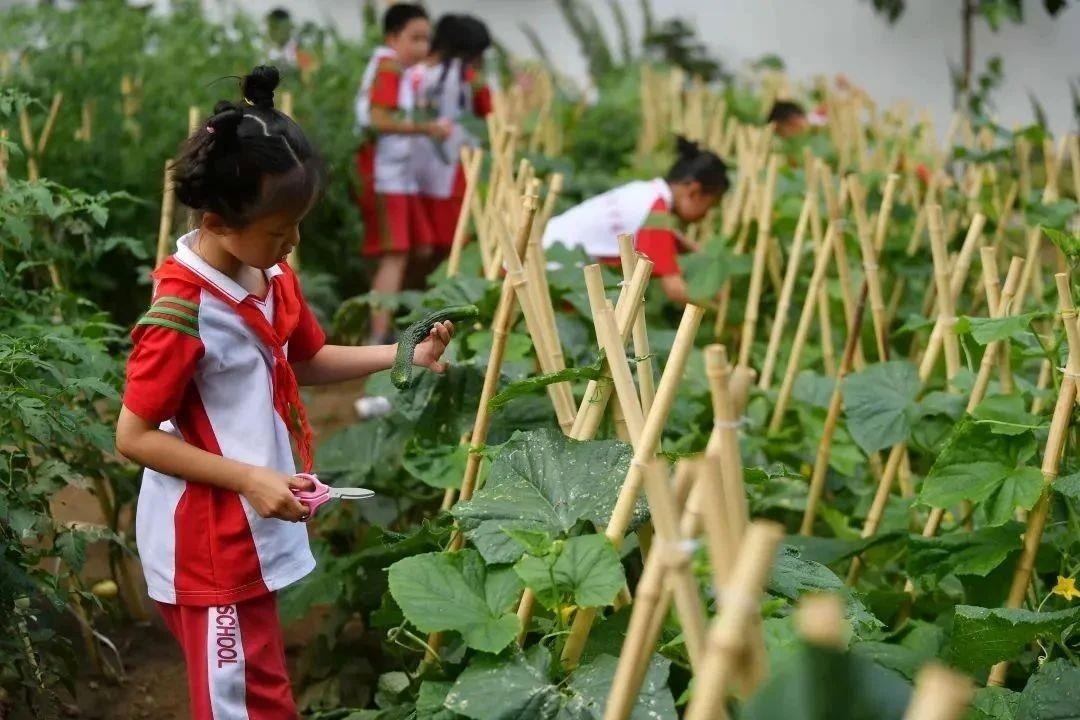 △今年6月,育英學(xué)校小農(nóng)場迎來豐收,同學(xué)們在采摘蔬菜。