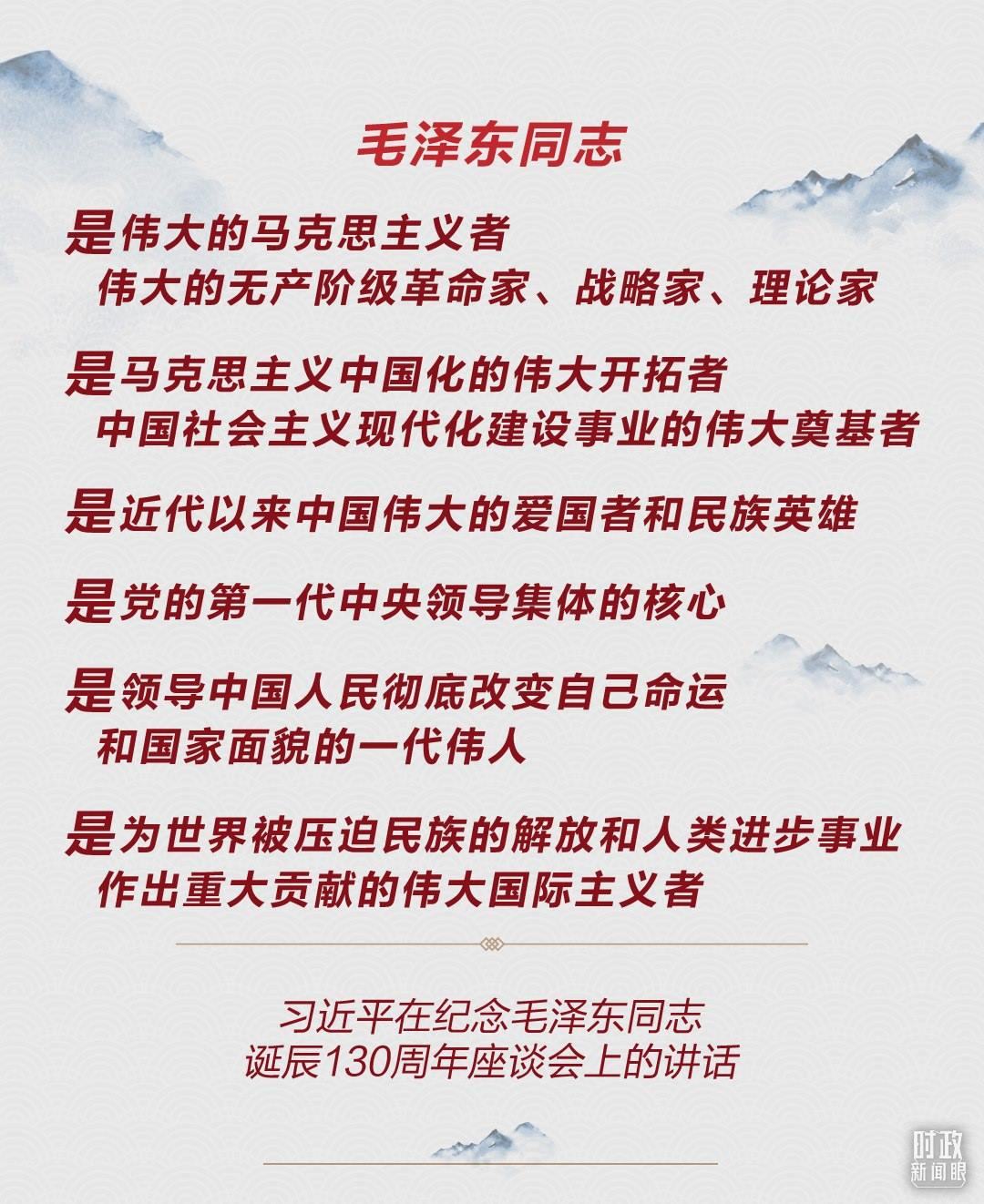 《時(shí)政新聞眼》注意到,與10年前的講話相比,總書(shū)記在今年這次座談會(huì)上增加了兩個(gè)新的表述:毛澤東同志是“中國(guó)社會(huì)主義現(xiàn)代化建設(shè)事業(yè)的偉大奠基者”,“是為世界被壓迫民族的解放和人類(lèi)進(jìn)步事業(yè)作出重大貢獻(xiàn)的偉大國(guó)際主義者”。