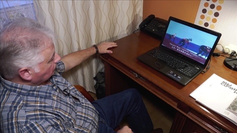 (▲弗拉基米爾·沃羅比約夫觀看由他創(chuàng)作的以北京冬奧會為主題的俄語歌曲《北京》)