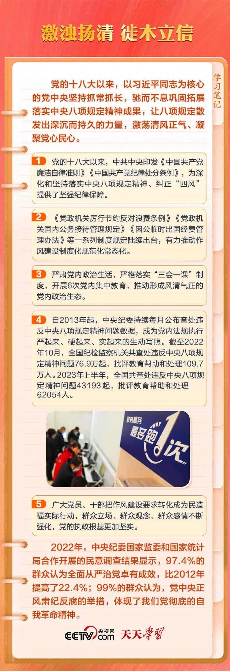 中央八項(xiàng)規(guī)定,短短600余字,涉及改進(jìn)調(diào)查研究、精簡(jiǎn)會(huì)議活動(dòng)等多方面。自出臺(tái)以來(lái),中央八項(xiàng)規(guī)定帶來(lái)的黨風(fēng)政風(fēng)社風(fēng)民風(fēng)變化,如涓涓細(xì)流,深刻影響和改變著中國(guó)。