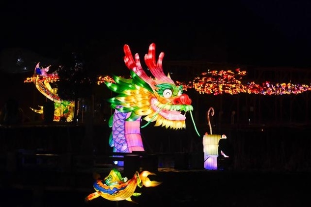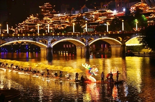 同樣迎來(lái)2024年龍年新春燈會(huì)的,還有湖北省恩施州宣恩縣城,這里的龍?jiān)煨蜔艚M格外亮眼,特別是其中一條非常壯觀的“貢水游龍”,龍身由30多只竹筏串聯(lián)而成,總長(zhǎng)度達(dá)到200多米。游客還可以登上龍船觀燈展、賞夜色。隨著金色的巨龍?jiān)诒趟序暄延蝿?dòng),也傳遞著吉祥的寓意。