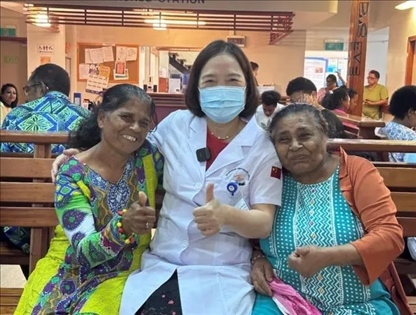 △廣東“送醫(yī)上島-光明行”醫(yī)療隊員與患者合影。