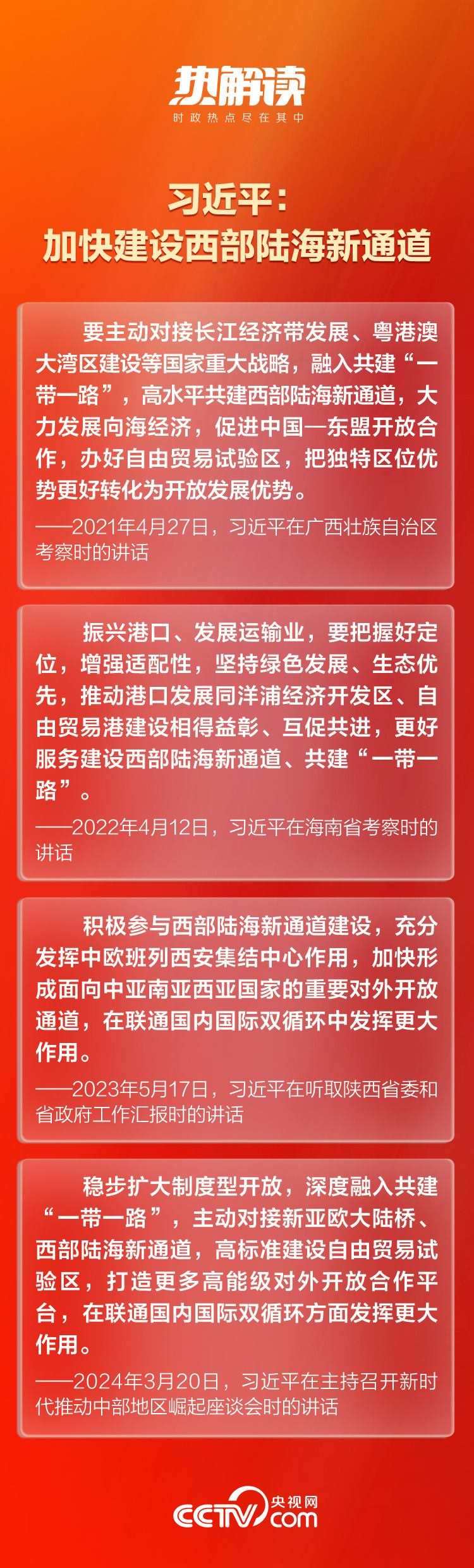 總書記一直對(duì)這條通道的建設(shè)十分關(guān)切。近年來(lái),總書記在貴州、陜西、廣西等西部陸海新通道沿線省區(qū)考察時(shí),多次對(duì)高水平共建西部陸海新通道作出重要指示。