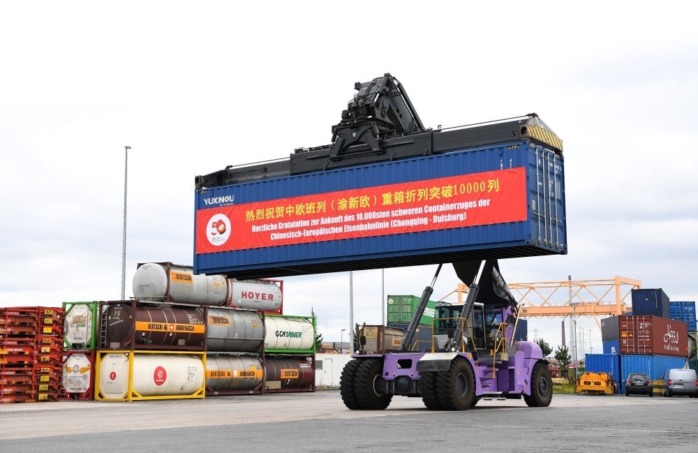 2022年7月11日,中歐班列(重慶)第10000列重箱折列抵達(dá)德國杜伊斯堡,這是接車儀式現(xiàn)場。
